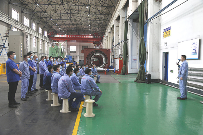 佳電股份技師、大型車間機座班組車工兼班組長程功在機座加工現(xiàn)場,通過PPT演示形式為班組職工講授《西門子數(shù)控車銑床編程知識》,深入淺出講解了編程過程中技術(shù)要點和5軸聯(lián)動結(jié)構(gòu)數(shù)控機床銑刀在X、Y、Z軸同時進刀的技術(shù)訣竅,有效提高了操作者在加工過程中的運算時間以及運算準確率。