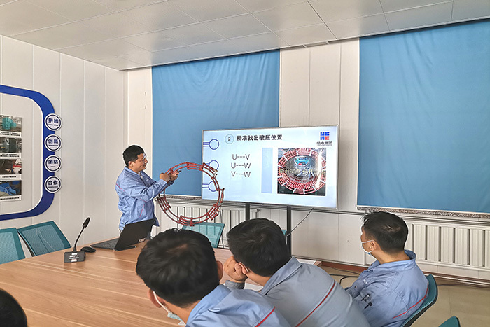 佳電股份高級技師、電工車間接線工成明坤以實際案例向職工詳細講解了繞組接線的重要性以及常規(guī)三相接線圓圖的繪制,通過自己制作的接線線路實物,詳細地向大家分享了快速尋找破壓點的小竅門,僅需要一個萬用表和一把斷線剪,通過分相→分組→分頭就能快速找到故障位置。