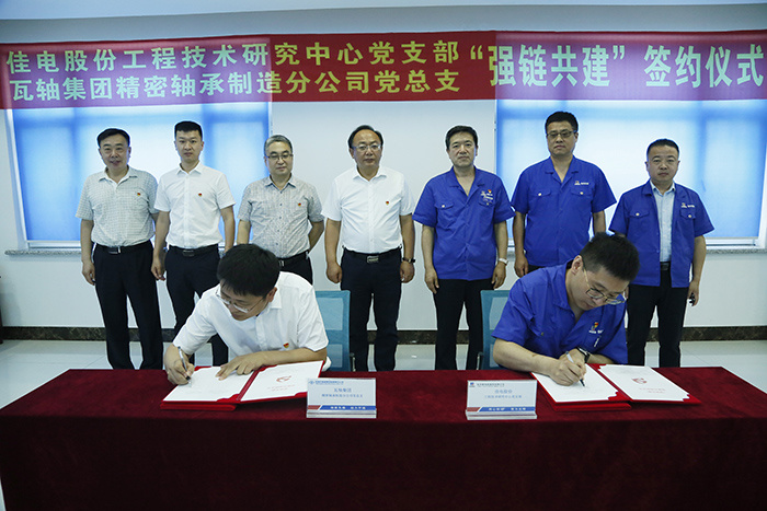 為深入貫徹落實哈電集團“三級書記抓質(zhì)量”工作要求,深入開展“強黨性 精技術 提質(zhì)量 優(yōu)服務”主題黨日系列活動,積極向供應鏈延伸加大黨建共建力度,以黨建引領促進技術水平和產(chǎn)品質(zhì)量提升,近日,哈電集團佳電股份工程技術研究中心黨支部與瓦房店軸承集團精密軸承制造分公司黨總支開展以“強鏈共建”為主題的聯(lián)建共建活動。并簽訂黨建共建協(xié)議。佳電股份黨委副書記劉漢成、瓦軸集團黨委副書記孫世成出席簽約儀式。瓦軸集團代表在公司領導陪同下參觀了企業(yè)展廳和生產(chǎn)車間。