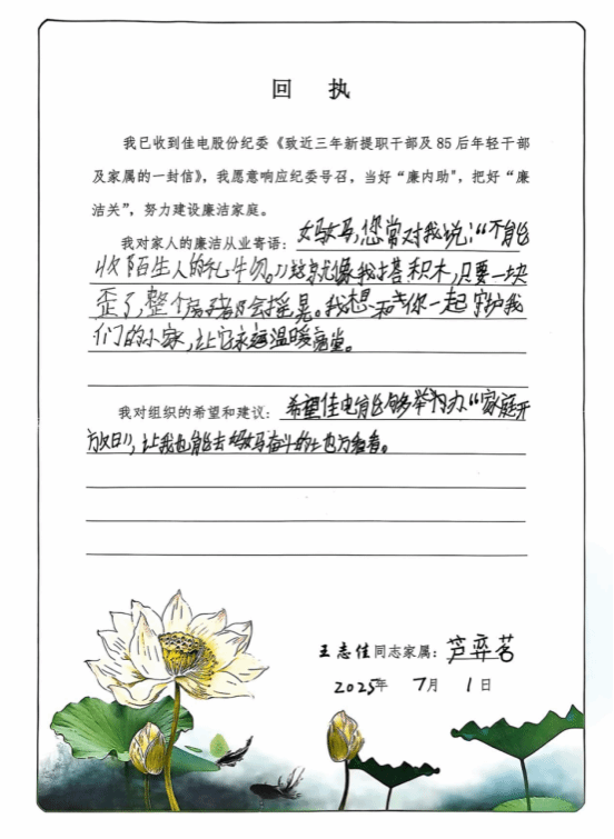 佳電股份將廉潔教育觸角延伸至“家庭”陣地,向近三年新提職干部、85后年輕干部及其家屬同步發(fā)放《家庭助廉倡議書》與《給年輕干部提個醒》廉潔讀本。倡議書中既有黨紀(jì)法規(guī)解讀,又含溫情寄語,旨在以家庭“小港灣”筑牢企業(yè)“大防線”?;顒又?,黨員干部與家屬共同研讀、深刻感悟,家屬們紛紛回信,字里行間滿是“廉潔齊家”的囑托與“慎終如始”的期許,讓清廉家風(fēng)在企業(yè)中傳遞。